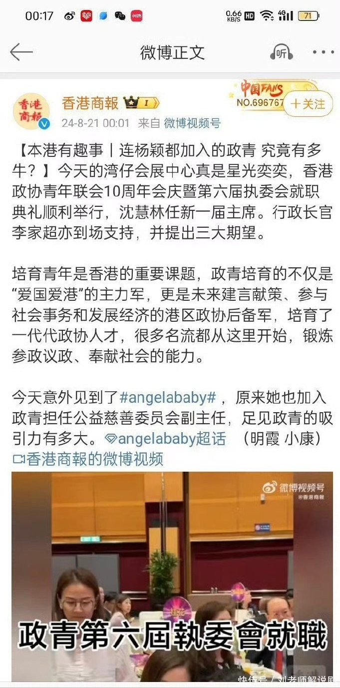 杨颖 官宣新身份在资格了一系列争议和负面新闻后,她并未选拔糜烂,而是通过参与公益活动,展现了我方的另一面。 2023年8月21日,杨颖以公益慈善委员会副主任的身份出席了香港政协后生联会十周年典礼。 这个新身份的官宣,不仅记号着她在职业上的转型,也体现了她对社会包袱的爱好。